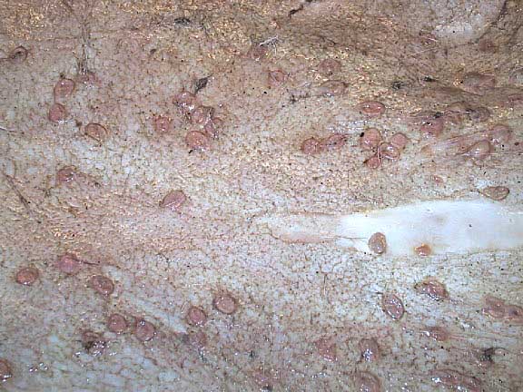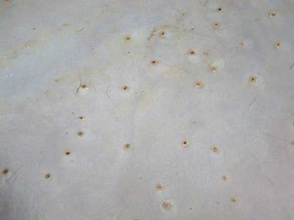 Kurmuntoukken aiheuttamia reikiä nahassa |